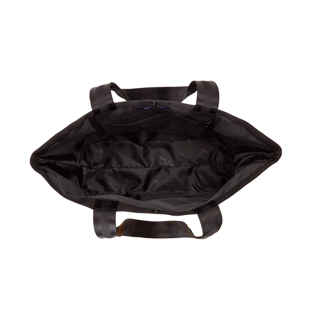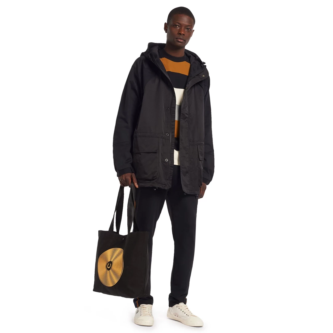 Perfect for record shopping, the Fred Perry discย graphic toteย bagย is the ideal size for your latest vinyl haul and features a spinning disc design on the front. Made of a durable cotton canvas with equally durable webbing straps and snaps close with a branded press stud. The interior features printed lining with an internal zip pocket.ย