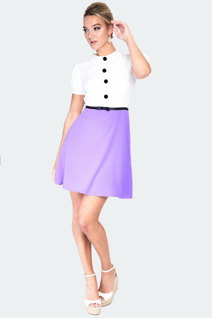 Step into spring in the captivating Jackie Contrast Babydoll Dress from Voodoo Vixen. A perfectly pastel piece, this retro dress has a pastel purple skirt with a white bodice that is embellished with black buttons and a delicate lace peter pan collar. The waist is cinched in with a black contrast trim centered with a single bow and the short sleeves have elasticized cuffs for comfort. A flattering shorter length, it hits about mid-thigh and fastens at the back with an invisible zipper.