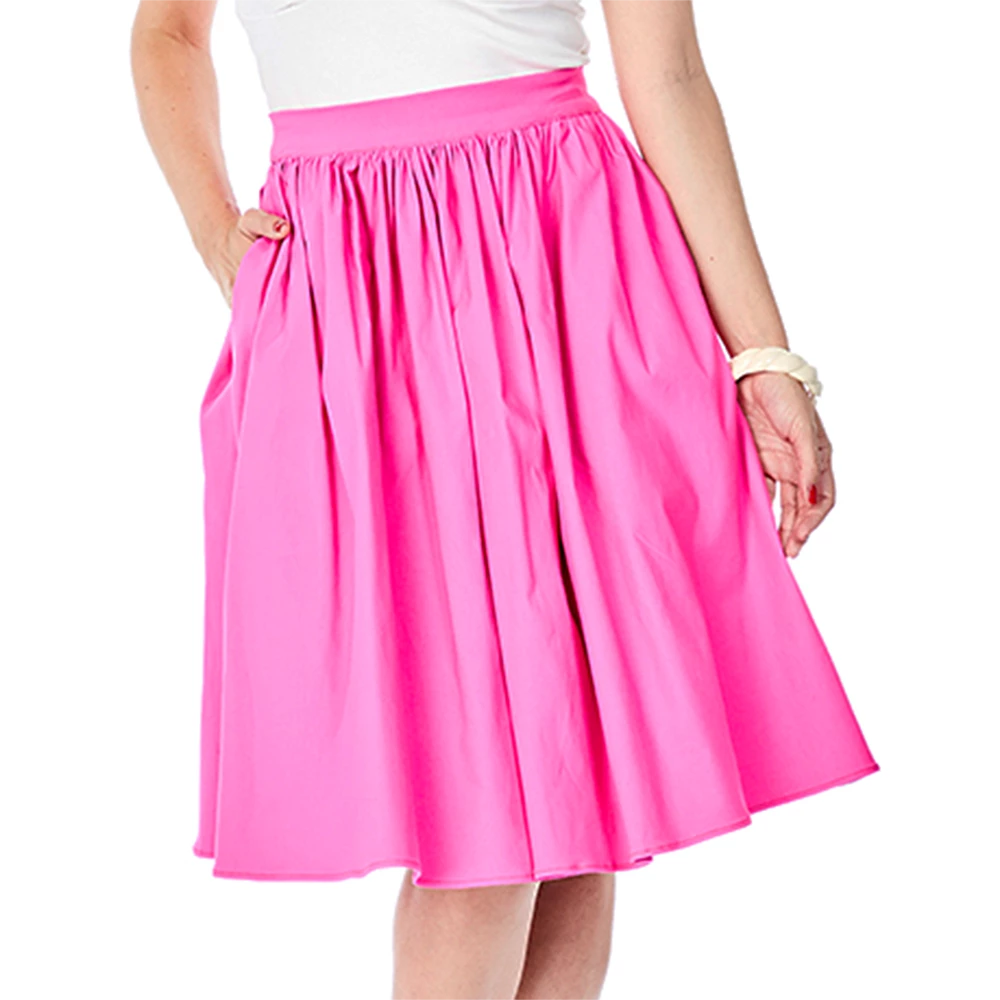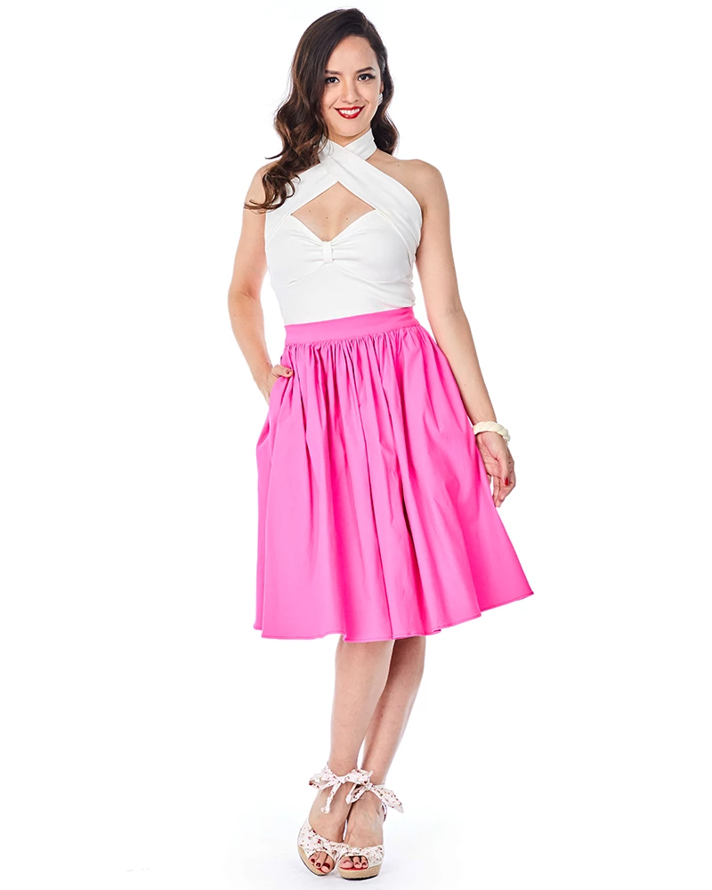 Add some retro flair to your outfit with the gorgeousย Ellie Gathered Skirt from Bettie Page Clothing! Crafted from a nice weight material in hot pink (seriously bright!), this gathered full skirt has a wide waistband and generous side pockets. Zips up back to fasten.