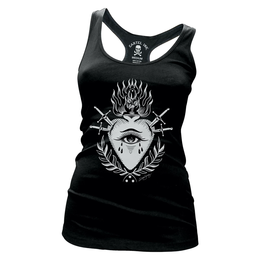 Worship me. This summer ready tank top from Cartel Ink features original Sacred Heart Eye artwork by tattoo artist Dave Sanchez on the front. Racerback style with a fitted cut.