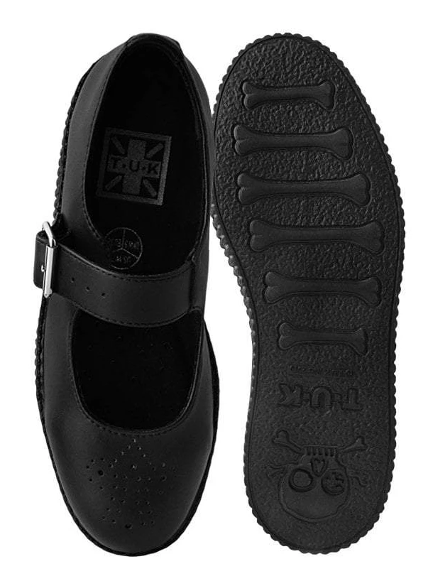 Perfect for the space in between casual and dressed up, these Viva II Mary Janes from T.U.K. never go out of style. Featuring a low platform height that is approximately 1.25โ at the heel and .75โ in the front and is made of a mixture of EVA and rubber that contributes to the soleโs bendability. The all-black upper made of high quality TUKskinโข material, a polishable synthetic faux leather that is both soft and breathable. Cute perforated detail at each toe. Comes with removable memory foam insoles for added comfort.