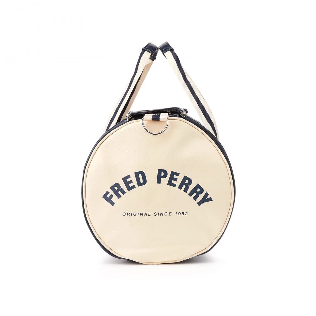 Used by sportsmen and women for decades, the classic Fred Perry Barrel Bag remains unchanged. Crafted from a tough PU in navy blue with ecru accents, this bag features strong webbing handles, debossed branding, silver-tone hardware, double-zip closure and a zipped compartment at one end. The interior has an additional zip pocket and zip compartment. Functional, durable and unmistakably Fred Perry.