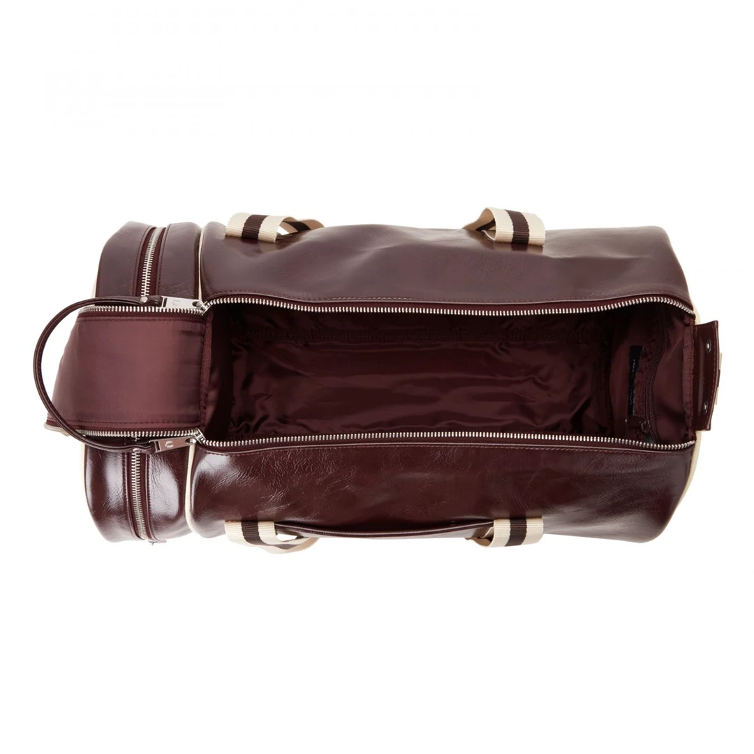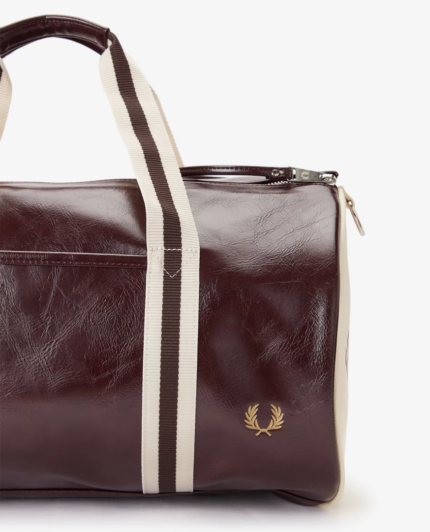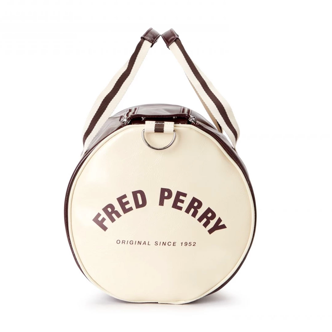 Used by sportsmen and women for decades, the classic Fred Perry Barrel Bag remains unchanged. Crafted from a tough PU inย port with ecru accents, this bag featuresย strong webbing handles, debossed branding, silver-tone hardware, double-zip closure and a zipped compartment at one end. The interior has an additional zip pocket and zip compartment.ย Functional, durable and unmistakablyย Fred Perry.ย
