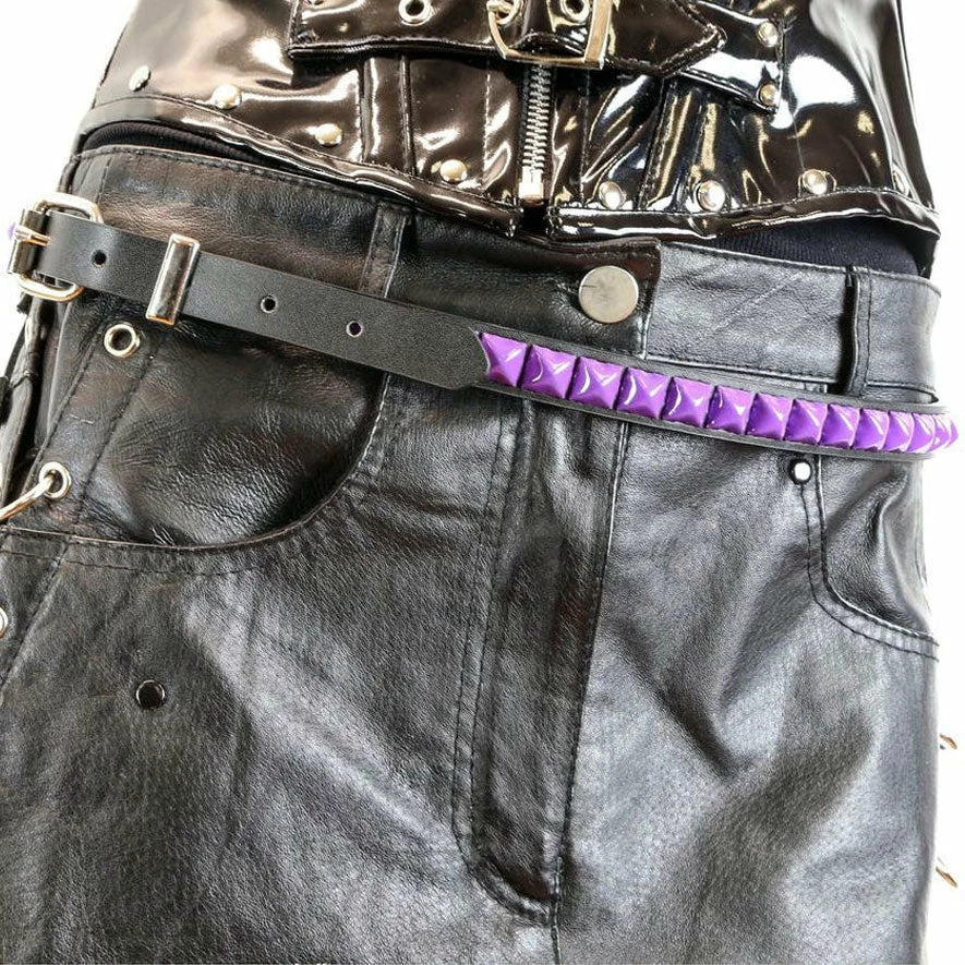 Made of a durable black leather with a single row of bright purple 1/2″ pyramid studs and removable buckle, this studded belt is a rock wardrobe classic. Always looks great layered with other belts too! Unisex sizing, view size chart for fit.