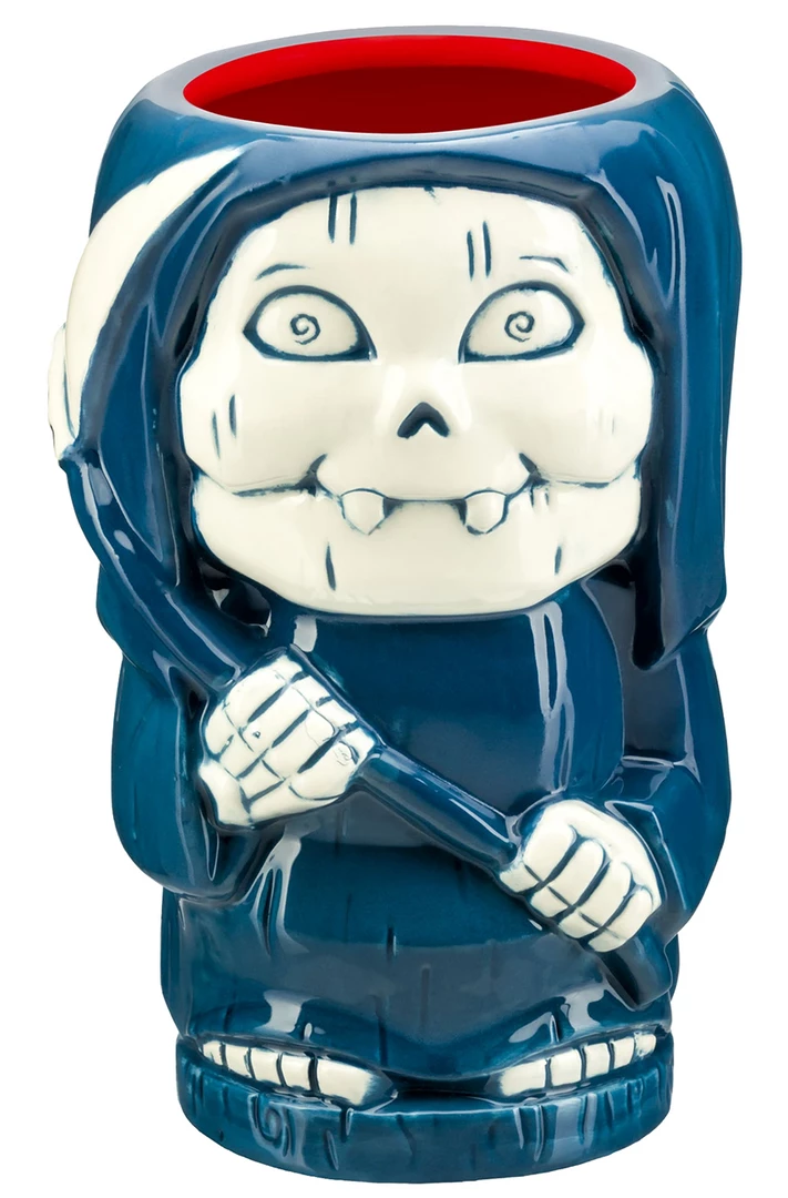 He looks like death! The Grim Jim Geeki Tikisยฎ mug holds 21 ounces of your favorite beverage and features a very scary design, just like the classic trading cards! Each Geeki Tikisยฎ mug features beautiful sculpted detailing true to the character it is paying homage to. These ceramic mugs are high-quality, microwave and dishwasher safe. Experience the aloha with every sip!