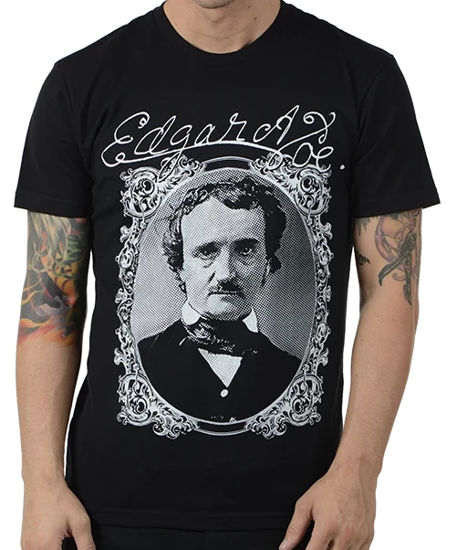 Classic image of Edgar Allan Poe with an antique looking frame and his signature above it printed on a black, unisex t shirt.