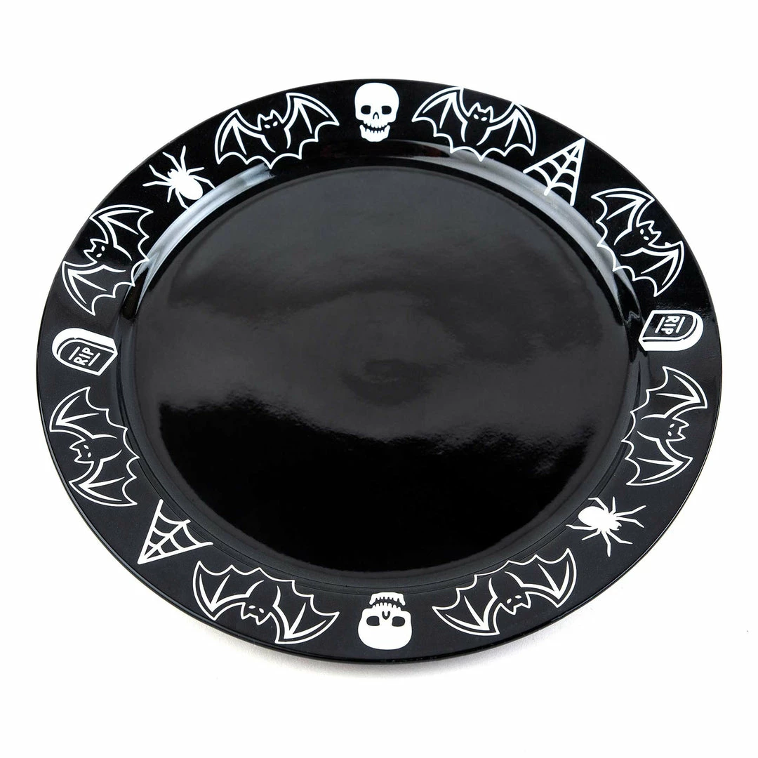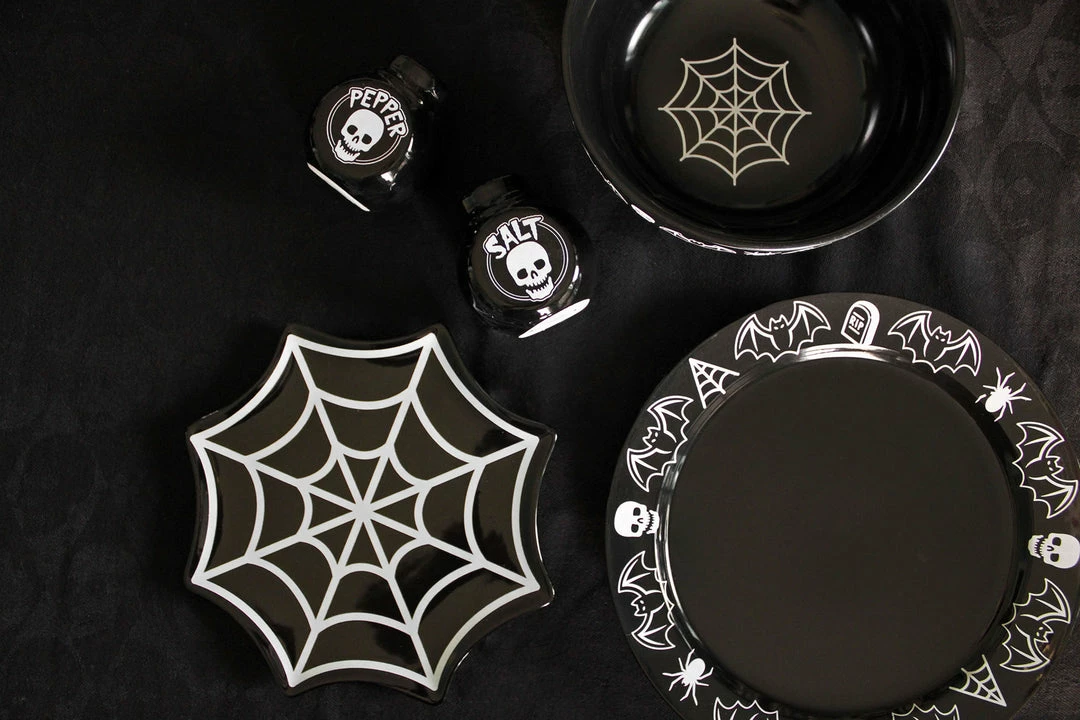 Dinner will be even tastier on the creepy and cute plates. Made of a shiny black porcelain with a white printed edge filled with bats, spiders, webs and coffins.