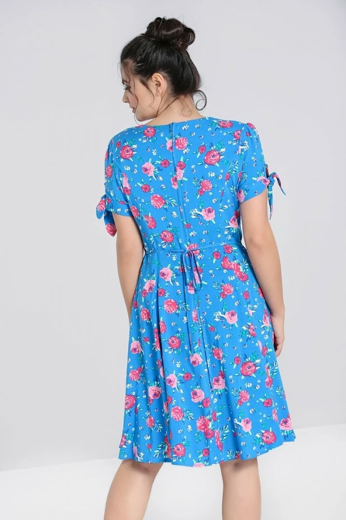 Florals your thing? Opt for this gorgeous Chantilly Mid Dress from Hell Bunny! This vibrant blue a-line dress is decorated with pretty pink flowers throughout and features cute, short sleeves with adjustable ties for your comfort. The modest v-neck leads to a cinched waist that has an adjustable matching tie. Zips up back to fasten.