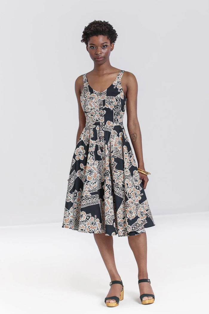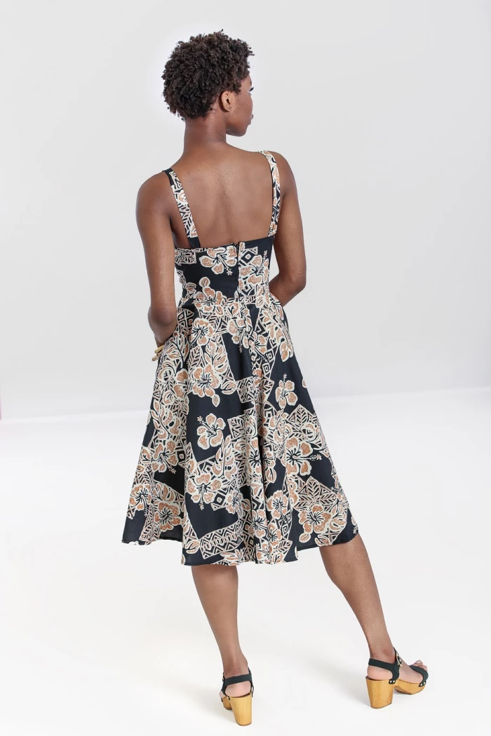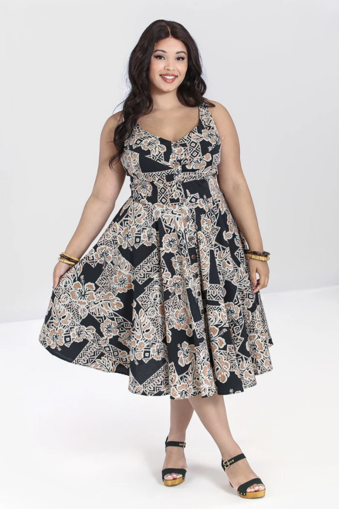 Bring those tropical tiki vibes with you wherever you go in the fun Dominique 50’s Dress from Hell Bunny! Crafted from a vintage inspired floral in black and brown, this dress features wooden look buttons and pockets. The flattering fit is accented by self fabric straps that have buttons at the back to adjust the strap length if needed. Zips up center back to fasten. Just add sandals, some bamboo jewelry and your favorite hair flower for a chic summer ensemble!