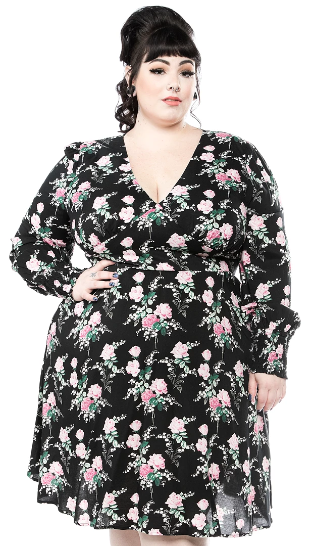 The Felicia Dress from Hell Bunny is a fabulous cooler weather dress option! Featuring a pretty print of roses and lilies of the valley in white and pink on a black background, this retro inspired dress has long sleeves, a flattering v-neckline and shearing detail at the cuff. Dress fastens at back with a center zip.