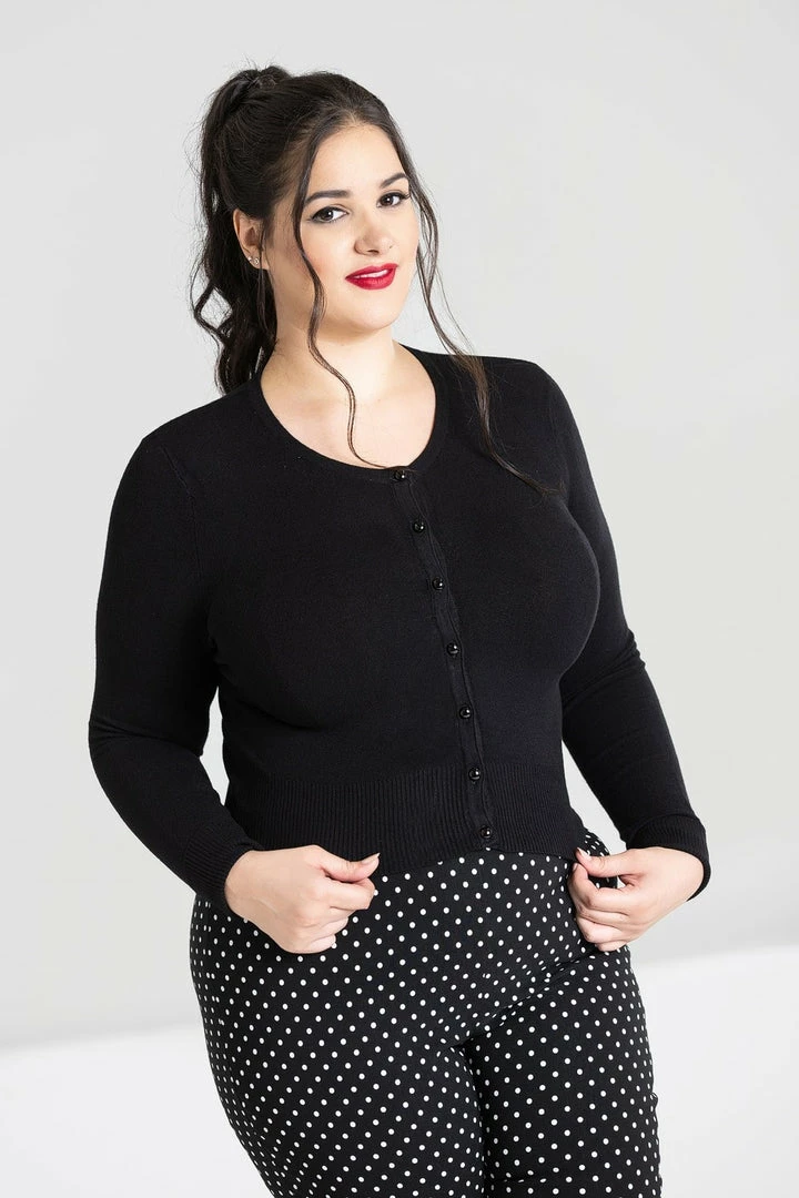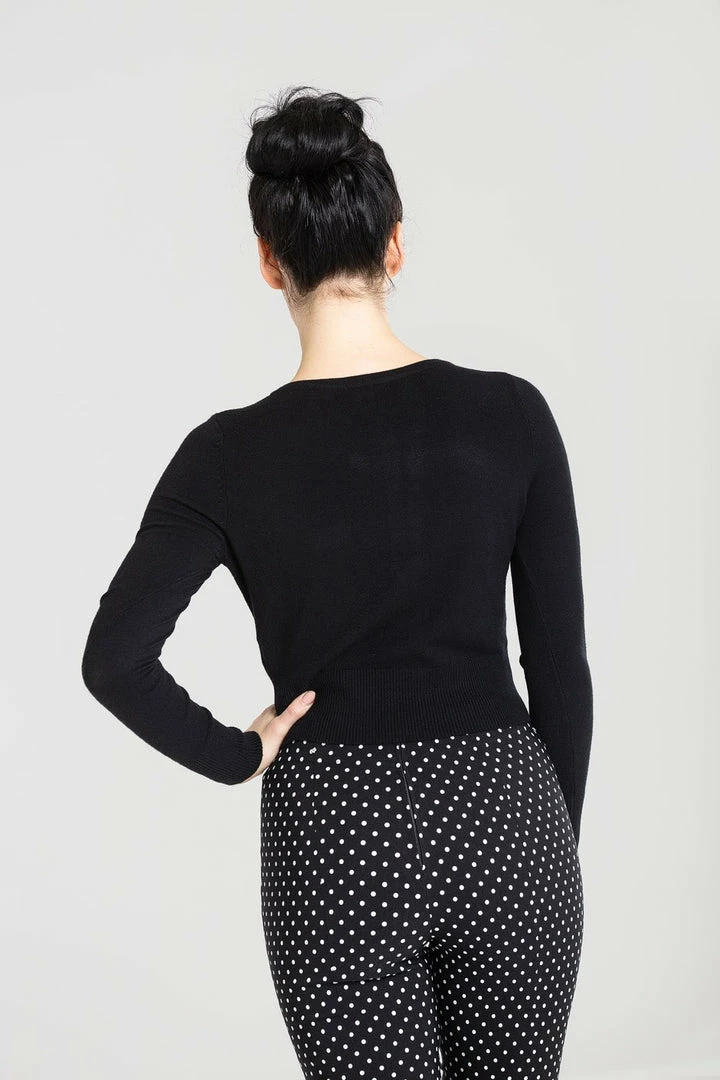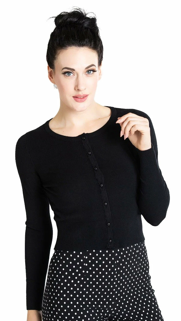 Top off your retro look with the perfect little cardigan from Hell Bunny! The Paloma Cardigan in black features ribbed cuffs and hem, and a row of clear glass effect buttons down the front in black to match. Perfect for dresses and skirts, this cardigan hits right at the waistline.
