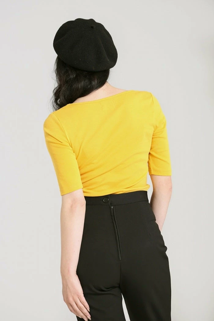 If you’re looking for the perfect basic top, look no further! This Philippa Top from Hell Bunny is a great match to skirts and pants alike with it’s ruched detailing at the sweetheart neck and 3/4 sleeves. It’s made of a soft and stretchy jersey fabric in a gorgeous shade of mustard yellow – perfect for fall!