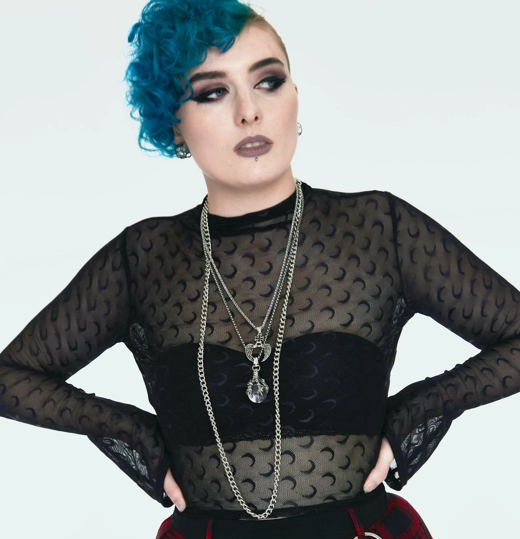 Get Moonstruck in this mesh top from Jawbreaker. Crescent Moons on a sheer mesh make this pullover top the perfect layering piece or looks great worn over a cami or bra (bra shown not included). Extra long sleeves for added drama. Super stretchy and pairs great with so many things!