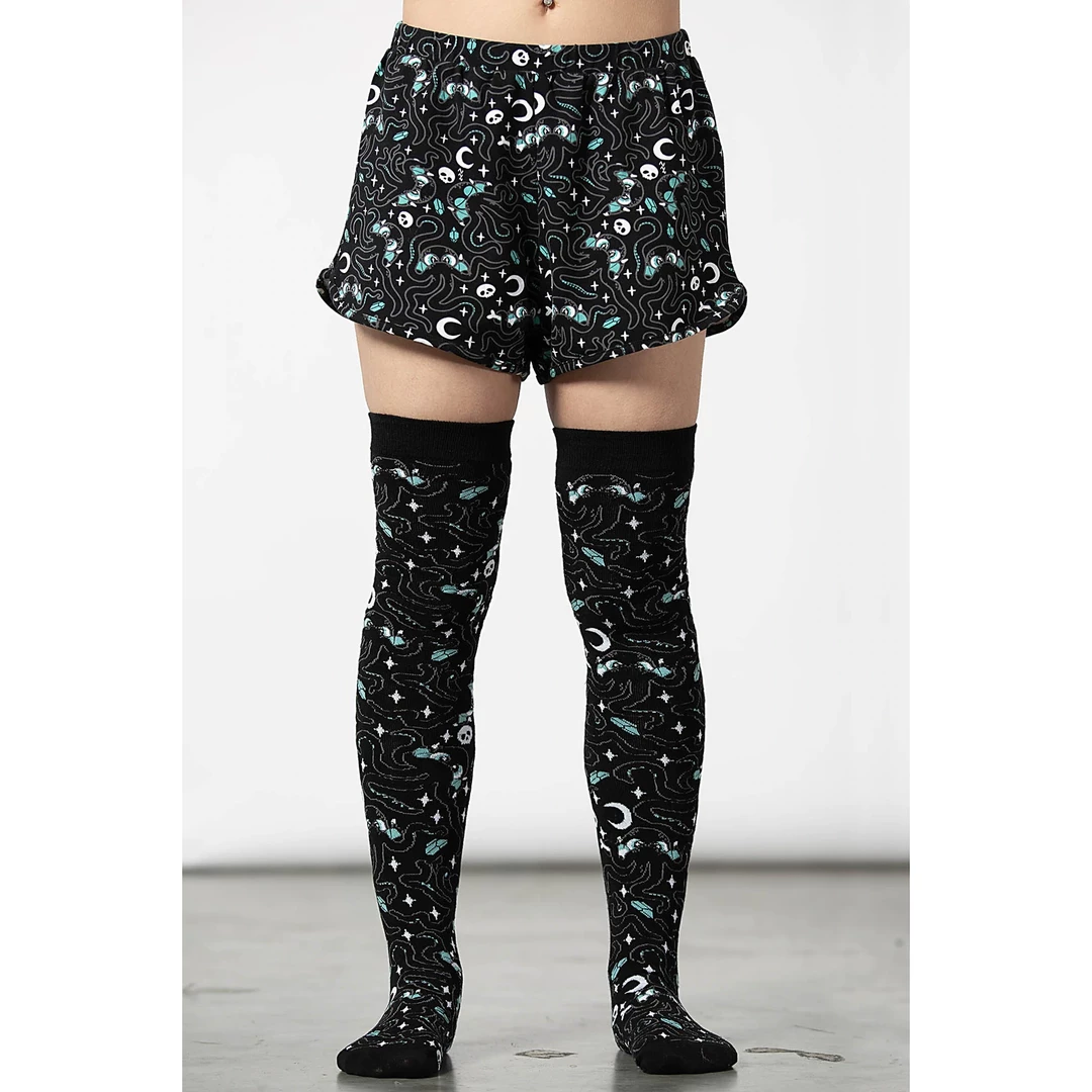 Relax with the Sleeper of R’lyeh with these Cthulhu lounge shorts from Killstar. Made of a super soft and stretchy cotton with a statement all over Cuthulu print, they’re perfect as PJs or just as everyday lounge wear when you wanna be comfy! Mix and match with the coordinating Strappy Top and Pet Tee to compete the look.