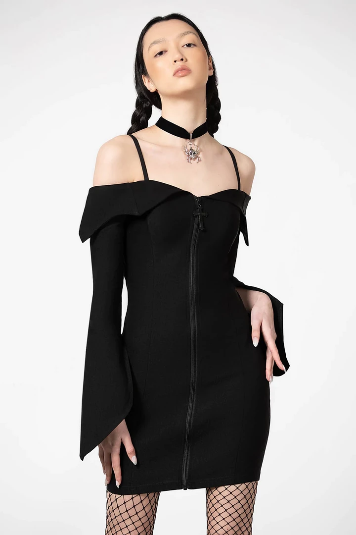 Embrace the dark drama in the Demelza Bardot Zip Dress from Killstar. Made of a soft stretch fabric with a full length zip, this curve hugging black dress is made to fit and flatter. The open, Bardot style neckline has adjustable straps, while the long bell sleeves add even more drama. The front zipper has a detailed, metal cross pendant for classic gothic flair.