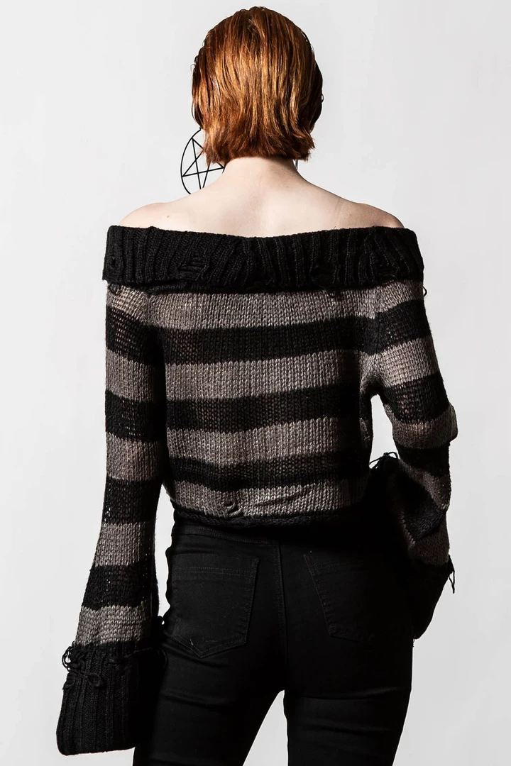 SKU: killstar-7189081063583 Categories: Apparel, Sale, Shop Sour+Plus, Sweaters, Tops, What's New Tags: Alternative, Bardot, Crop, Gray and black, Stripe, Unique, Witch, Witchy