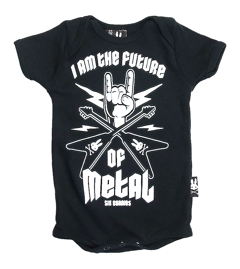 The future of metal is here! Get em’ ready to rock with this super soft, black, one piece from Six Bunnies with envelope neck opening and high quality snap closures for easy dressing and changing.