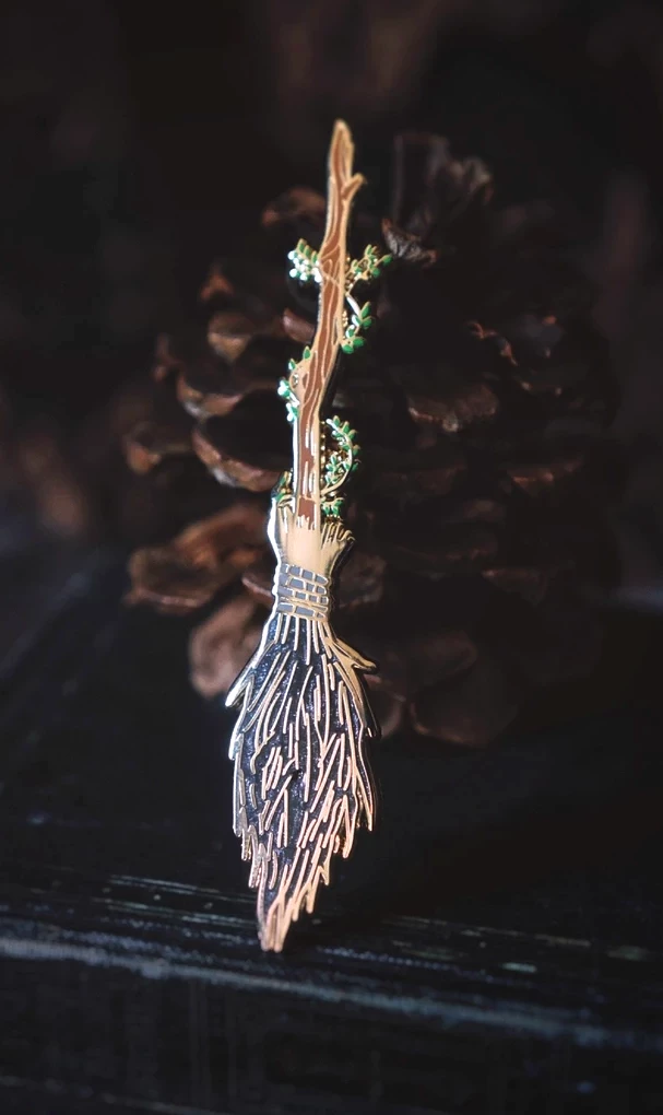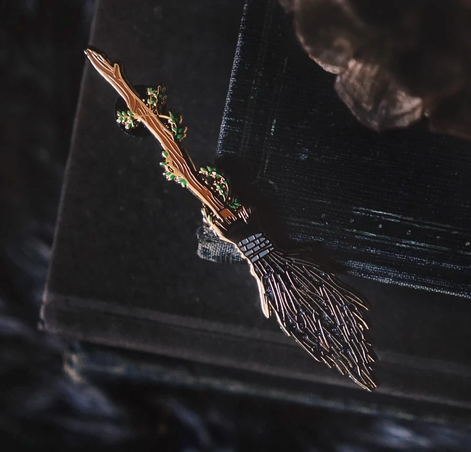 From within the dark forest…the Witch of the Woods emerges. This gorgeous pin from Lively Ghosts of this nature crafted broomstick features extra magical black glitter enamel accents.