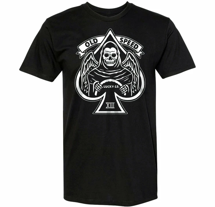 Lucky 13 branded slim fit t-shirt. Bold grim reaper taking the wheel, outlined in a spade.