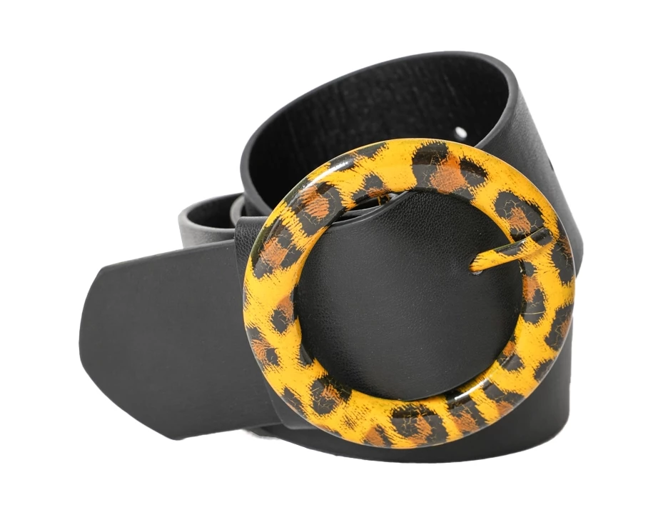Add a little touch of leopard to any outfit with this fun wide belt with a leopard print ring buckle. Looks great over dresses!