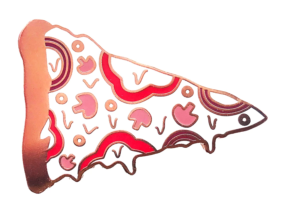 Who needs pepperoni when veggies are involved! This slice is a vegetarian pizza fiend’s dream, crafted in rose gold metal pin form forever.