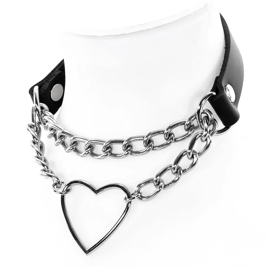 Chains of love, set me free! Show ’em yer all heart with this chain n’ leather choker, complete with heart shaped ring and layered chains. Goes on with a buckle at the back.