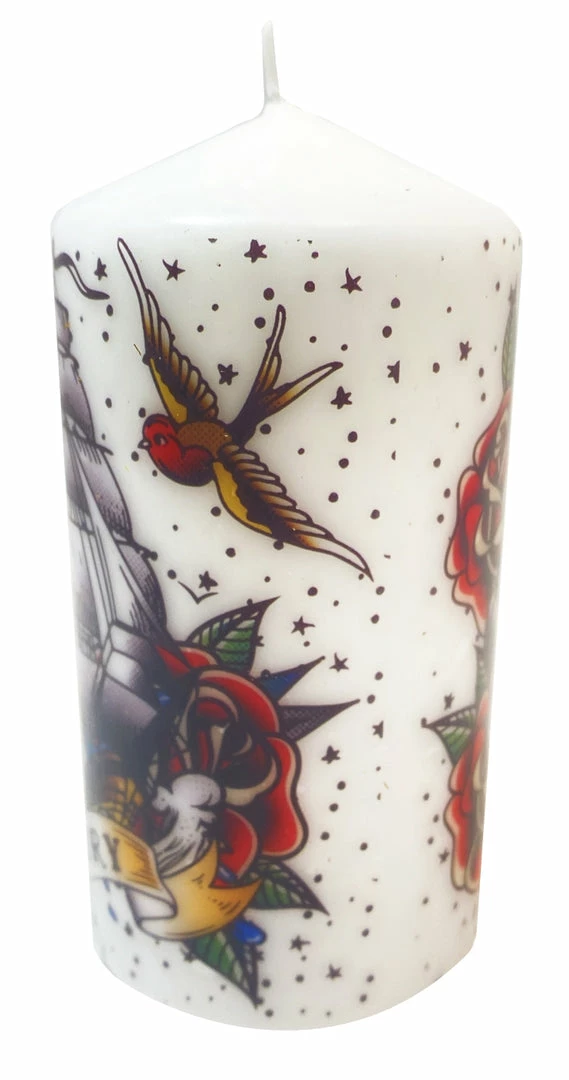 Vintage-inspired traditional tattoo designs cover this paraffin wax pillar candle. Beautifully presented in a matching gift box, it’s almost too pretty to light!