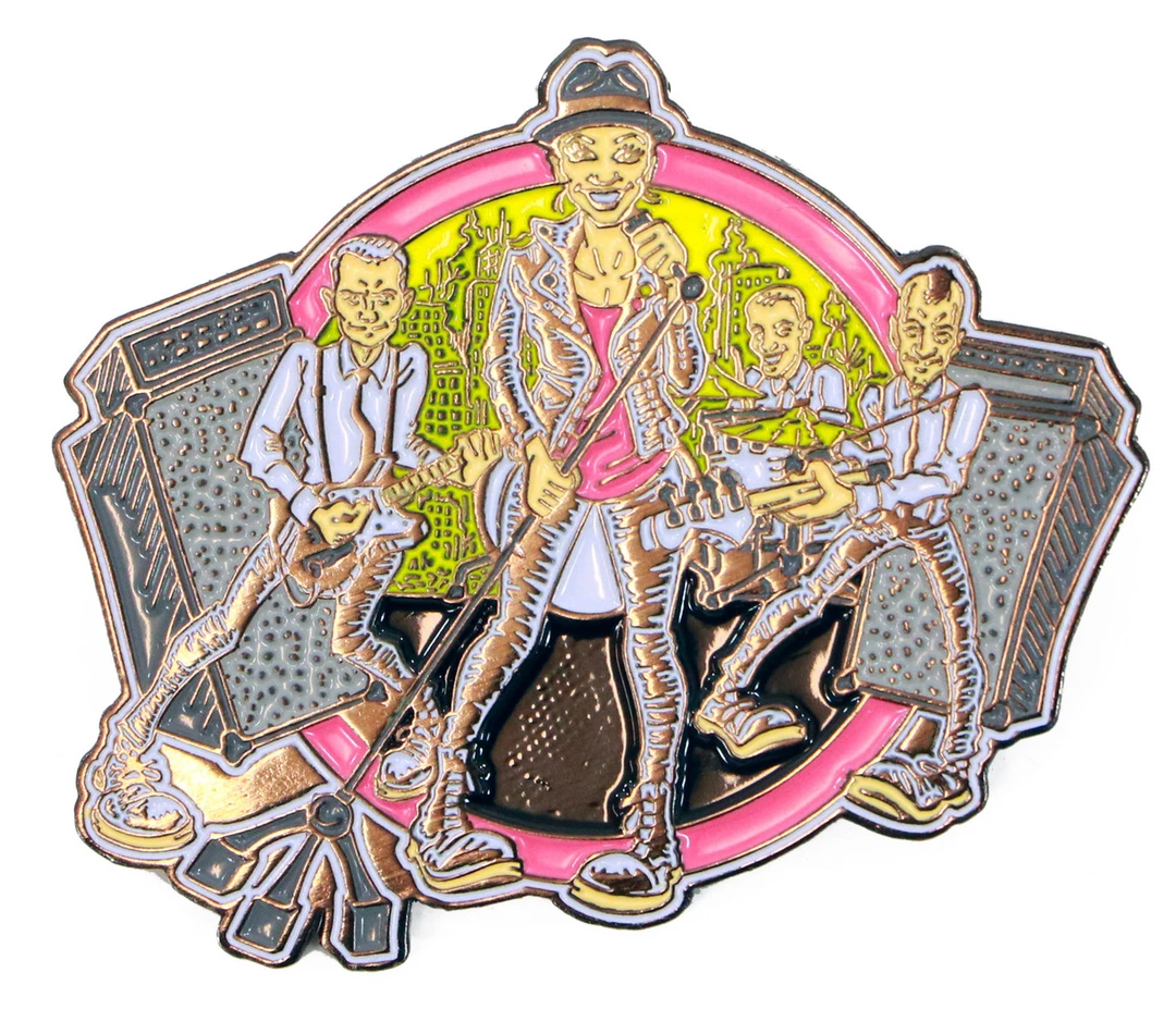 The Interrupters cartoon design, featuring a cartoon portrait of the band, on a high quality enamel pin.