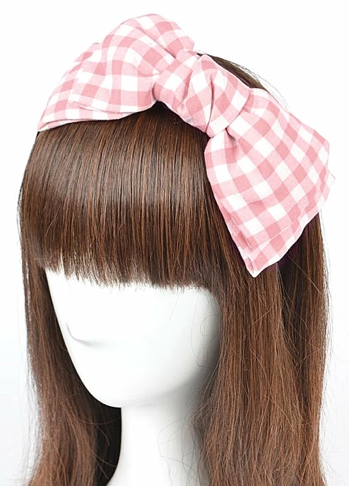 Add some gingham sweetness to your look with this Patty Gingham Bow Headband in pink and white. The large gingham bow is on a black headband – looks great paired with all your favorite retro outfits!
