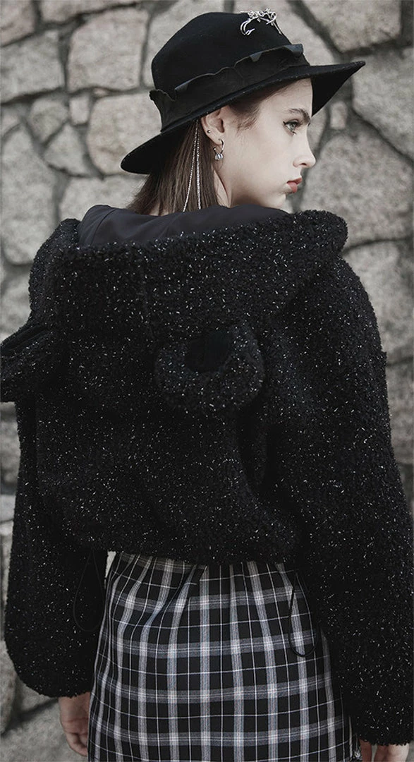Emerge from hibernation in cozy style in the cutest cropped jacket from Punk Rave! Made of a soft fleece material in black with specs of white, it has a generous sized hood complete with bear ears. This jacket is cropped at the waist and has an