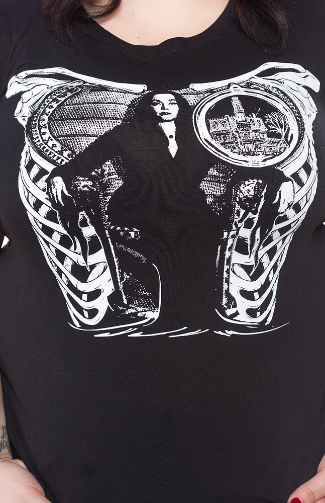 Keep your love for the matriarch of the Addams Family, Morticia, close to your chest with this graphic tee from Rock Rebel! It features their unique design printed on a soft, black, fitted ladies tee.