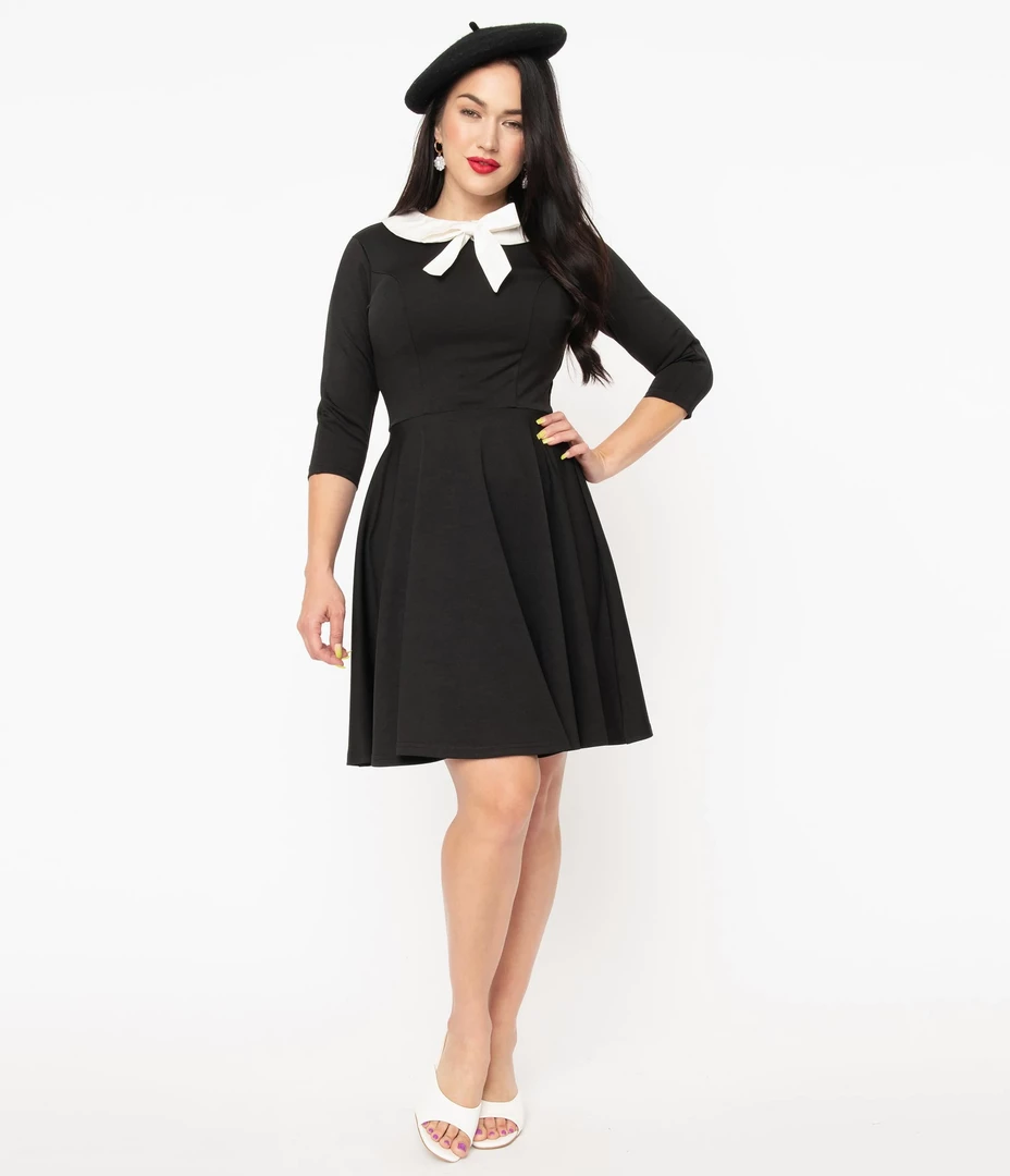 Classic and super chic, the Collared Wednesday Flare Dress in black and white from Unique Vintage is a retro lover’s must-have! Crafted in a black stretch knit fabric topped with a white peter pan collar, centered with a self tie white bow. Framed by the three-quarter length sleeves, the princess seamed bodice is cinched with a back zipper while flirtatious flare skirt drops from the seamed waist to create a playful silhouette!
