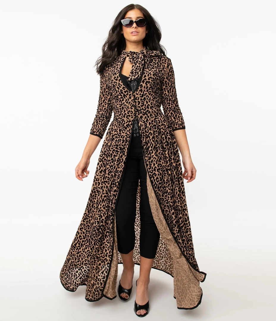 Have the fiercest outfit in the room with this duster from Unique Vintage! The Tallullah Duster is a dramatic and eye catching addition to your vintage wardrobe. Featuring a leopard print mesh that moves freely, the unique robe rocks a self tie neck bow, three-quarter length sleeves, and a flattering banded waist that is nipped in with buttons. The maxi skirt drops to the floor while the open front serves that dramatic look!