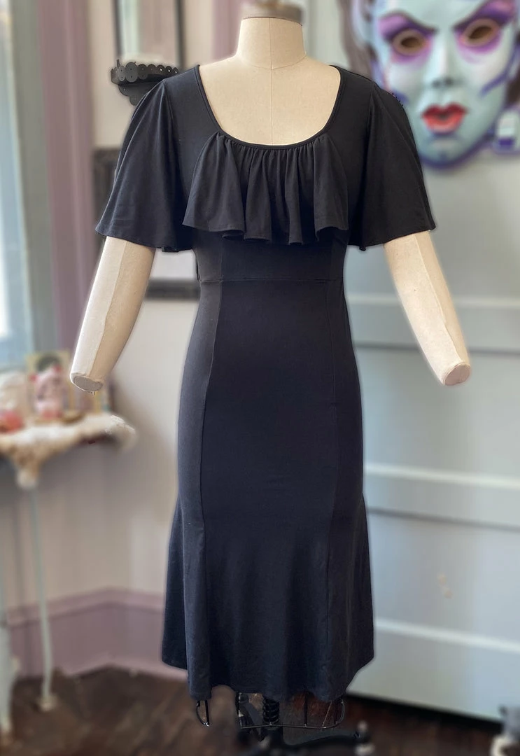 A wiggle dress that’s fit for royalty! The Duchess dress from Wax Poetic features a flouncy bib detail, capelet style sleeves, a keyhole cutout at the back neck, and a slight fishtail hem. It hits right around mid-calf, depending on your height. The fabric is a super soft and stretchy brushed knit that is breathable and sooo comfy to wear!