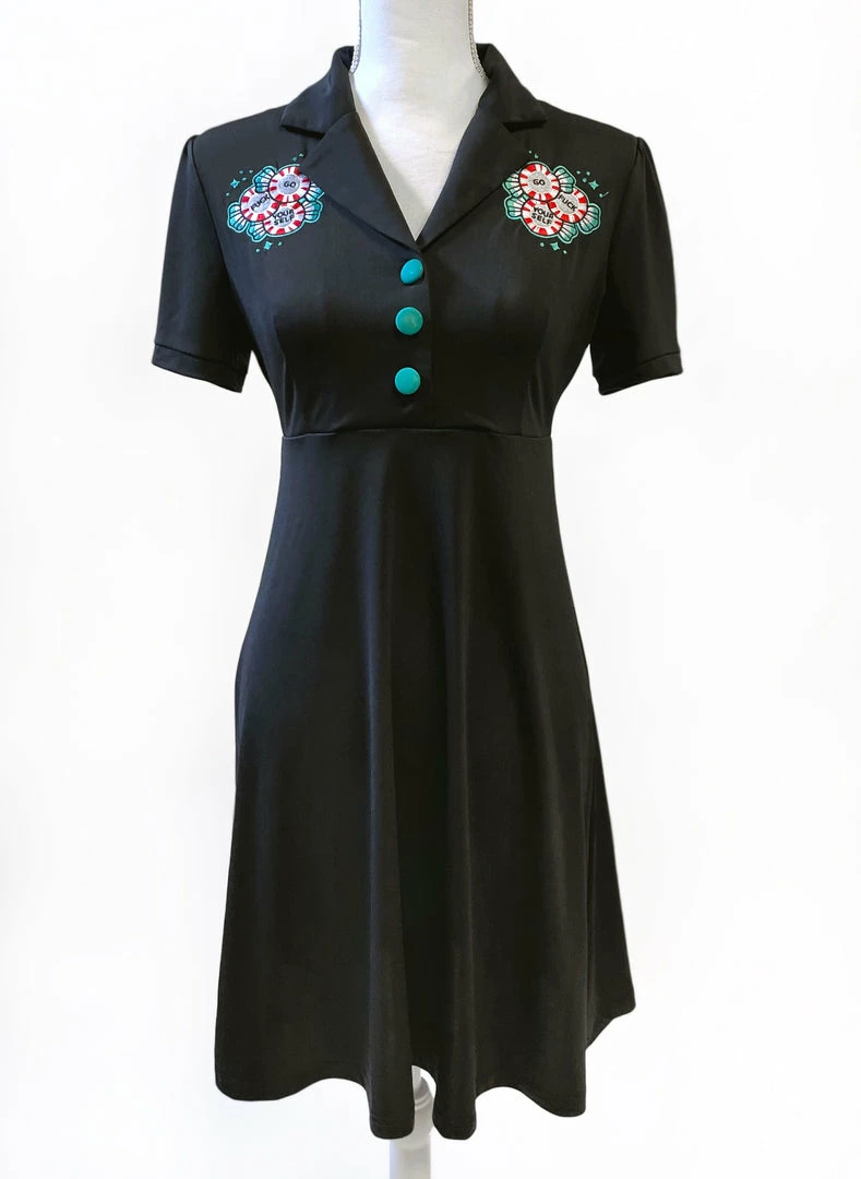 You don’t always have to be sugar and spice and everything nice… you can also be stylish, minty and mean! (That sounded better in my head.) Anyway, we’re continuing the Sourpuss tradition of putting our feelings on our chest with the new GFY Candies Rosie dress! Our best selling silhouette, yay!) and of course these absolutely perfect little “Go Fuck Yourself” Peppermints. This dress is super stretchy and ultra flattering, with a 1940’s silhouette and a-line skirt.