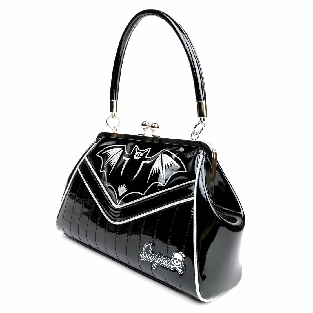 Worthy of any vamp’s wardrobe, our Nokturnal Bat Kisslock Purse in silver is a surefire knockout. Crafted from a high gloss black vinyl with silver glitter vinyl accents, this purse is full of all the vintage inspired details you love; a kisslock closure, tuck and roll style stitching and piping. The highlight is our killer Nokturnal Bat artwork front and center, in silver. The inside is fully lined with multiple pockets to keep you organized and that lipstick within reach!