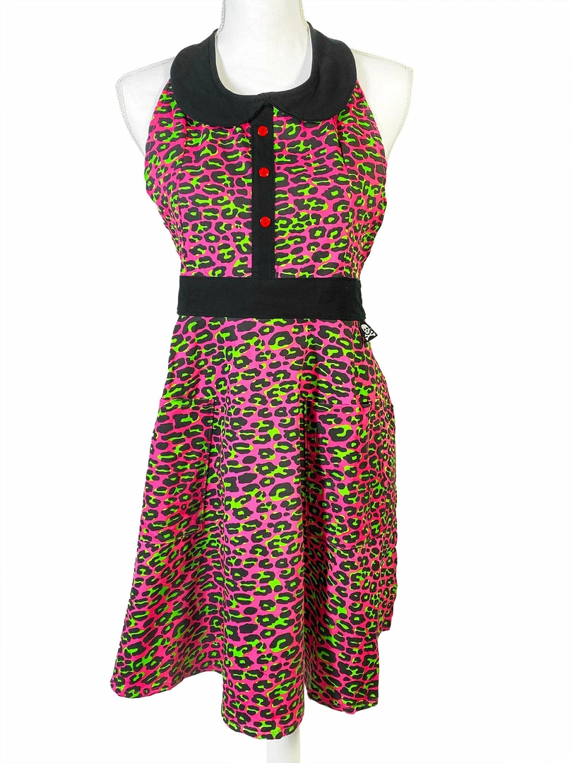 Finally! We have the perfect apron for all the punk rock kittens out there that like to cook. Blast some Lunachicks and make a soufflé! This cotton apron is in a bright pink leopard with pops of neon green, contrast red button detail and then trimmed in black. We’ve added pockets to hold your phone or recipes!