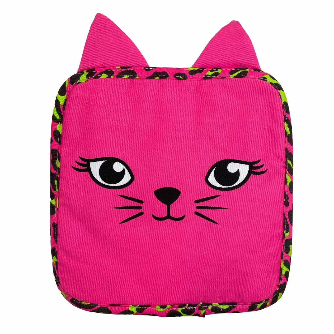 It’s time to turn the volume up on your music and your kitchen. Think pink and cats! Two of my favorite things. We have an oven mitt and pot holder set in bright pink with a splash of neon green and black with a Sourpuss of cat face. You’ll be cooking up something good in no time.
