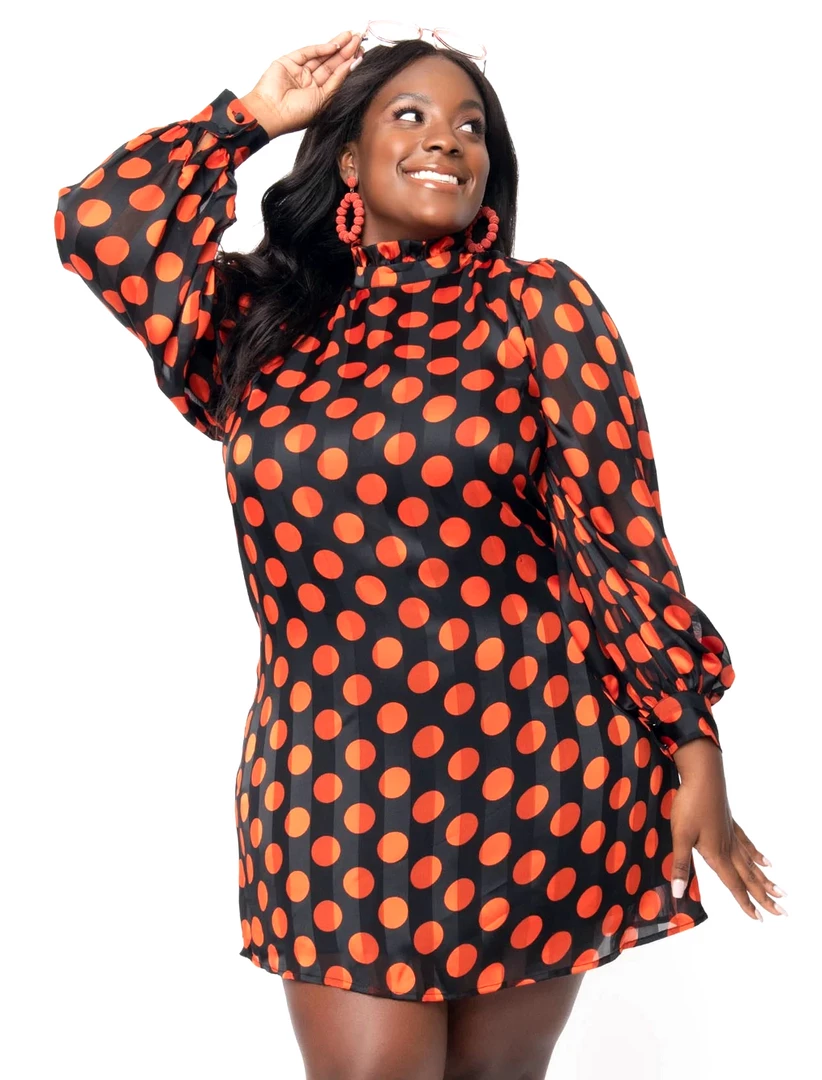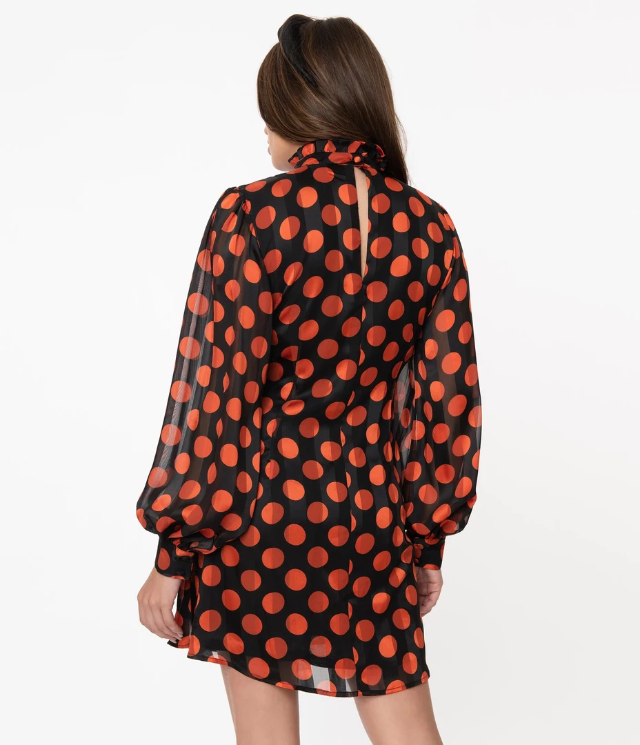 Adorably cute and retro minded, this sweet silhouette from Smak Parlour boasts a Halloween perfect orange polka dot print throughout a black backdrop. Crafted in a lightweight striped crepe, the darted bodice and slightly tapered waist lends a dash of form while the high ruffled neckline is secured in the back with a button keyhole. The billowing long sleeves are cinched with a button cuff while the shortened hemline creates a beautiful shape!