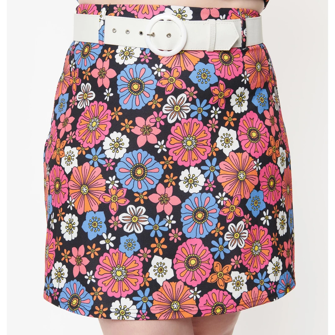 Crafted in a stretchy knit that dances with purple, pink, orange, and white retro florals throughout the black backdrop. The Take It Easy Skirt from Smak Parlour is a flattering piece with a back zipper andย includedย wide white belt for an easy cinch to your figure while the shortened hem dances above the knees for a stylish and chilled out silhouette! Pairs perfectly with the coordinatingย Feelin Groovy Top – alsoย available!
