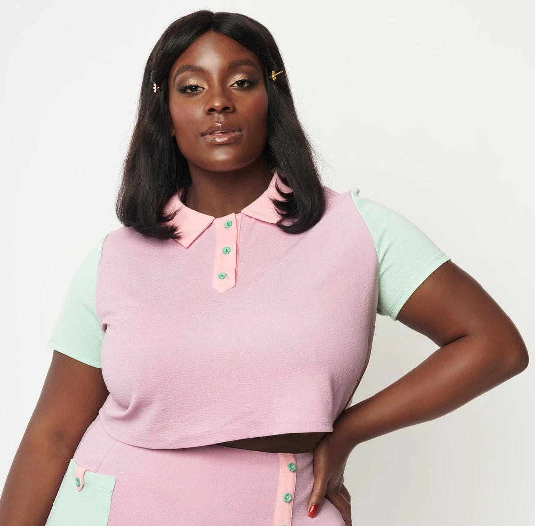 SKU: smak-parlour-7381987983519 Categories: Apparel, Shirts, Shop Sour+Plus, Tops, What's New Tags: Colorblock, Crop, Pink, Pinup, Plus size, Retro, Shirt, Short sleeve