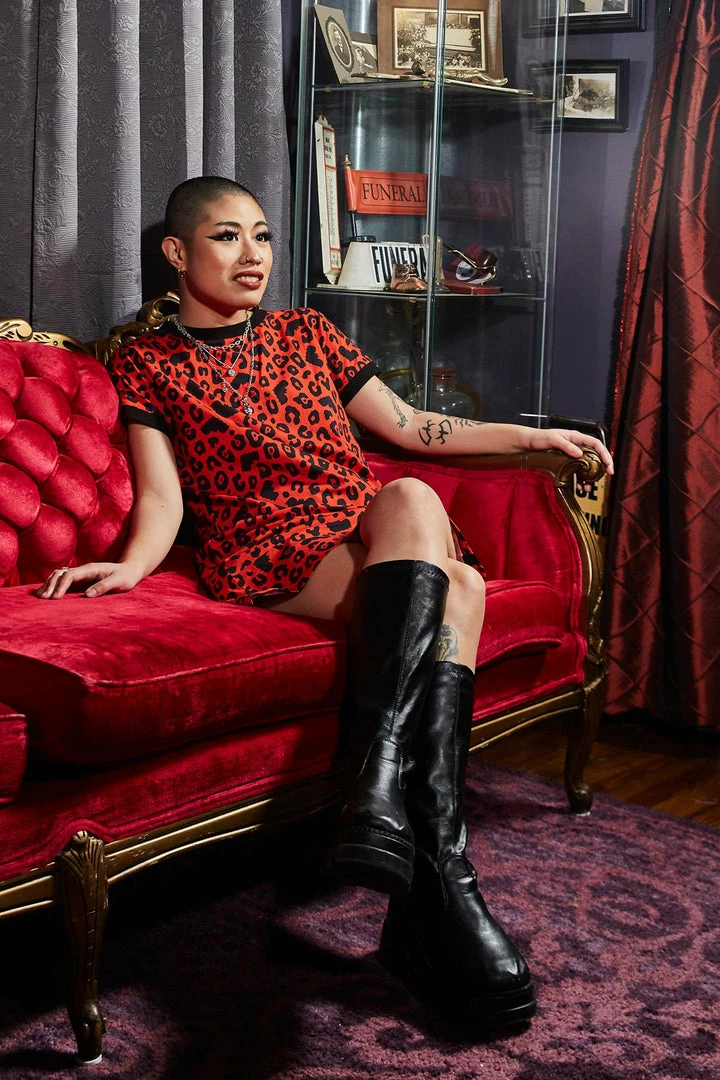 Your new favorite silhouette has arrived! The Ringer Tee dress is the perfect blend of fashion and comfort, with a slightly oversize fit, contrast sleeve and neck rib, and a Sourpuss flag label at the hem. It’s made out of a super soft and stretchy cotton spandex – you could totally sleep in it and then roll right out the door (we won’t judge.) The Batty Leopard print pairs another perfect combo – bats and leopard print!