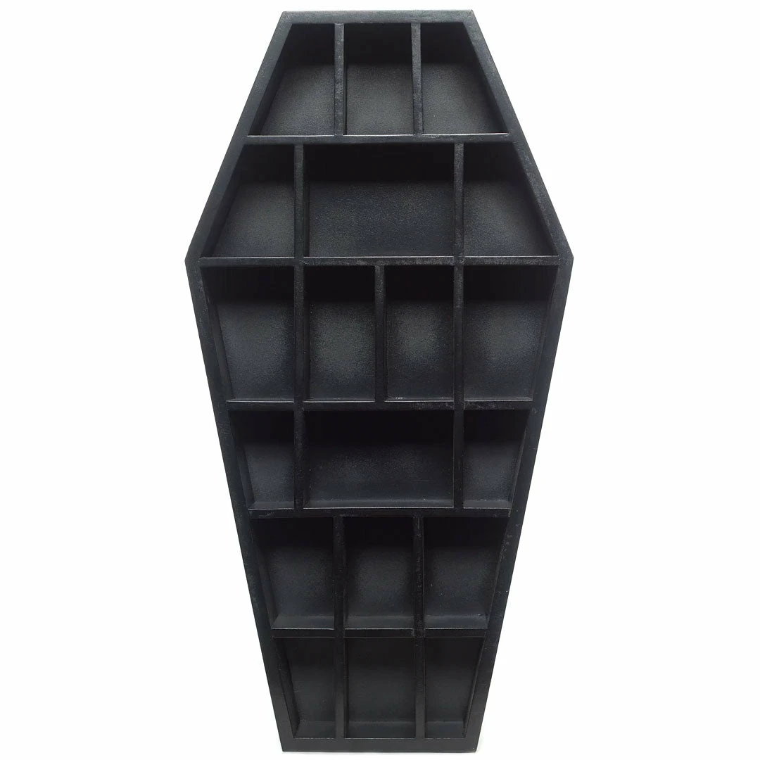 Forget about boring decor, because our Coffin Curio Shelf is perfect for adding some creepy fascination to just about anywhere! This shelf has 19 little compartments that’ll look great filled with your favorite small curiosities, creepy gems or morbid odds-and-ends. The possibilities are endless! Shelf is ready to hang thanks to the sawtooth hanger attached to the back!