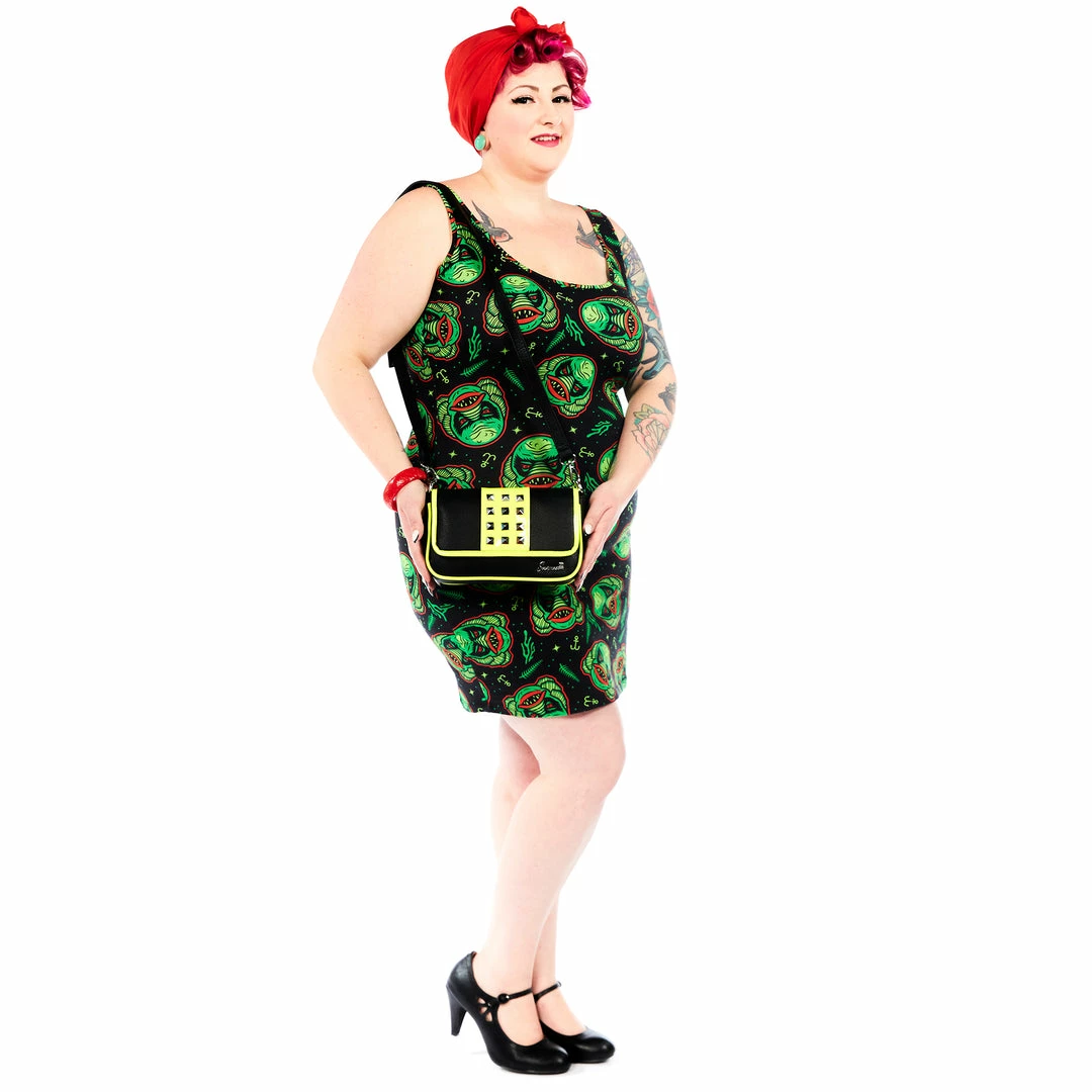 You’ll be the baddest babe in the swamp in the Sourpuss Creature Tank Dress!! This versatile silhouette is made out of a super stretchy, cotton knit and it’s digitally printed so that means no cracking, ever! Pair it with fishnets (ha! get it? fish…nets……) and creepers or boots for a killer look! *For our curvier babes, we recommend sizing up to minimize stretching of the fabric/design, especially in the hip area*