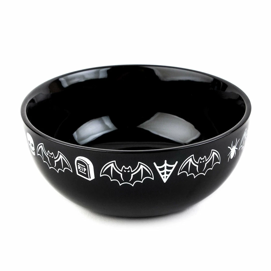 We’ve designed a creepy and cute bowl to enjoy your soup cereal or popcorn. Made of a shiny black ceramic and printed with skulls, bats, spiders, webs and coffins. Inside of the bowl is printed with a spiderweb.