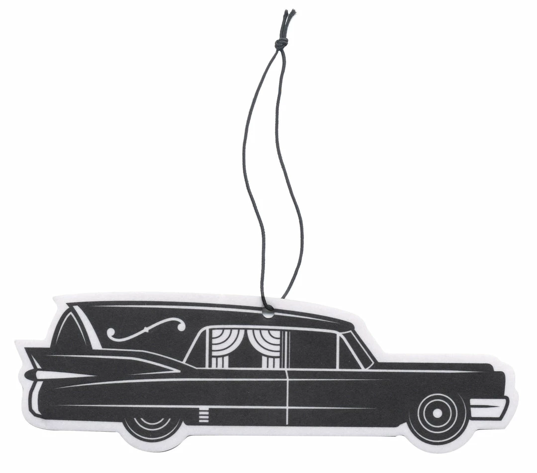 What better car accessory could there possibly be, than our Death Cab Air Freshener? It features our popular hearse artwork, and has that “new car” smell. It’s 6″ wide x 2″ high and perfect for hanging in your car, office, or anywhere you’d like!