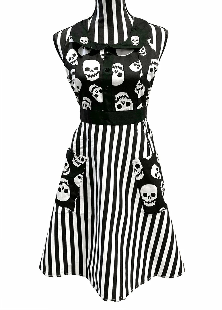 Turn up the music and get lost in your kitchen. It’s time to cook up your favorite tasty treats! Take it up a notch with the Lust For Skulls pattern apron. Nicely detailed with a rounded collar, buttons and two large front pockets for your phone or recipes.