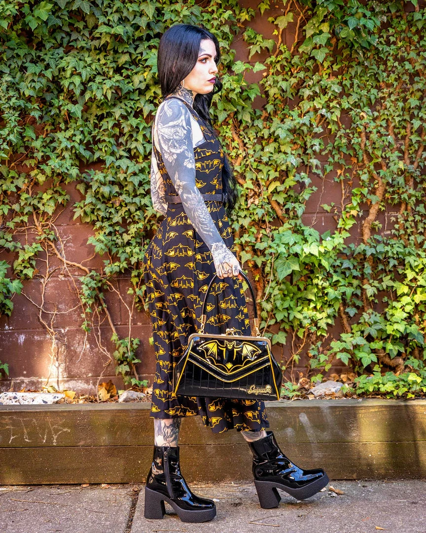 Worthy of any vamp’s wardrobe, our Nokturnal Bat Kisslock Purse in gold is a surefire knockout. Crafted from a high gloss black vinyl with gold glitter vinyl accents, this purse is full of all the vintage inspired details you love; a kisslock closure, tuck and roll style stitching and piping. The highlight is our killer Nokturnal Bat artwork front and center, in gold. The inside is fully lined with multiple pockets to keep you organized and that lipstick within reach!