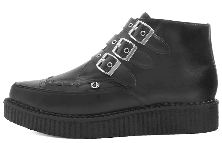 Keep your style sharp with these rocker ankle creeper boots that offers our same bold, iconic style in a vegan alternative option. These 3 Buckle Pointed Creeper Boots features an all-black upper made of their high quality TUKskin™ material — polishable synthetic faux leather that is both soft and breathable. Has a three-strap metal buckle closure with a low sole platform that measures approximately 1 ¼” at the heel and ¾” in the front. Includes removable gel insoles for added comfort. Shoe can be easily cleaned with mild soap and water.
