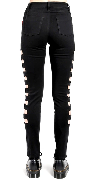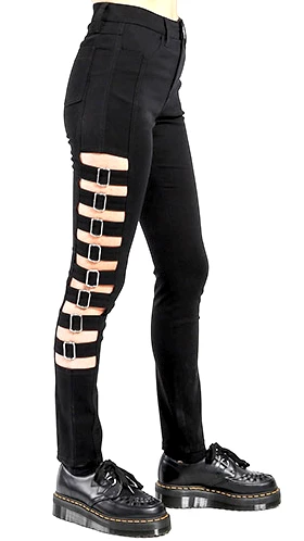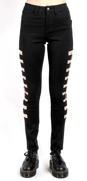 Buckle up in these kick ass skinnies from Tripp NYC! Classic five-pocket super skinny fit with full length buckle detailing on both legs, skull rivets, zip fly & button closure.
